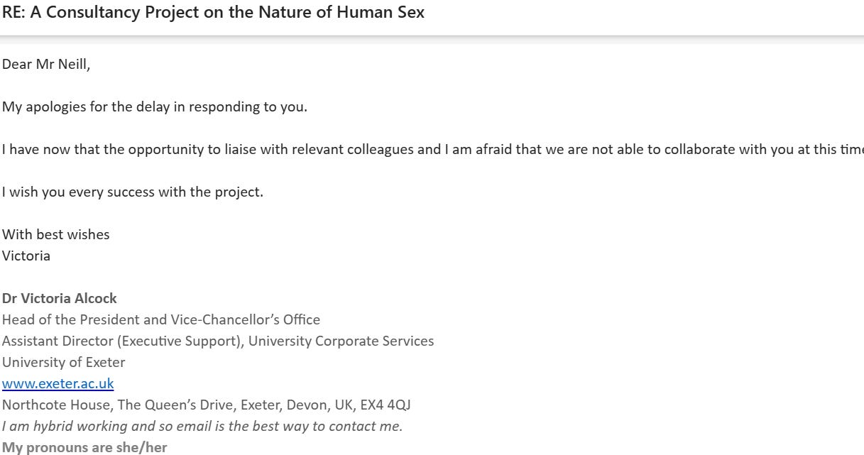 We approached Sussex University, who in Dec'21 had provided me with a statement that it was not the university's position that a male observed at birth could become a biological female. We suggested a Joint Exeter/Sussex project, but Professor David Ruebain declined.
