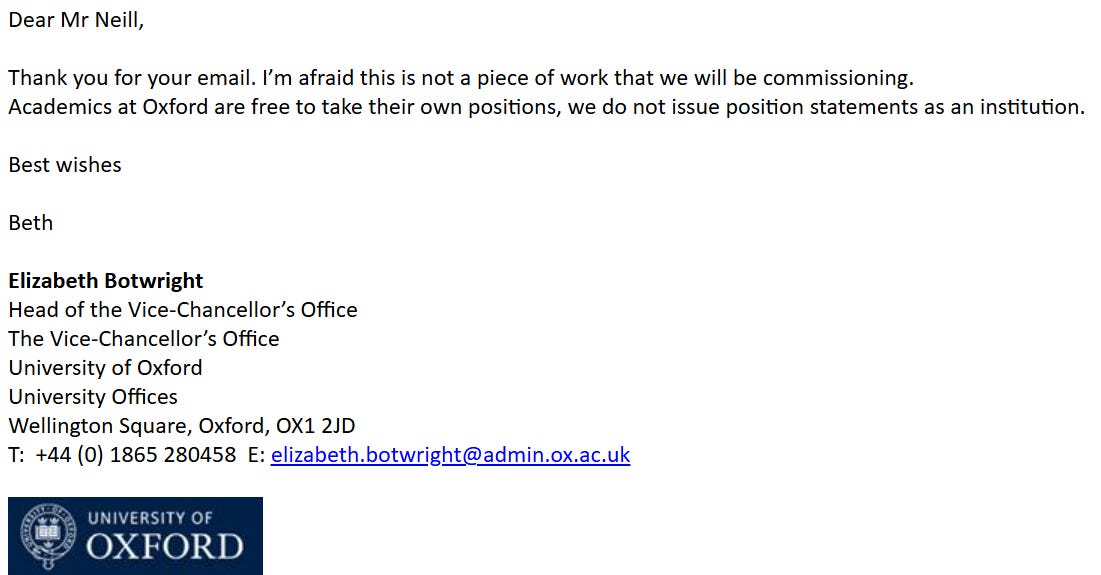 We can see no reason why Oxford University cannot, as an institution, issue a similar Position Statement to Sussex University on the binary and immutable nature of human sex. Would Oxford University take a similar position on issuing a Position Statement as an institution on whether the earth is spherical or flat?